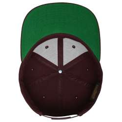 Mycket populär vinröd snapback-keps med platt skärm, grön underskärm, förstärkt frontpanel och matchande plastspänne i nacken. Passar 52-62 cm men sitter bäst runt 55-59 cm.