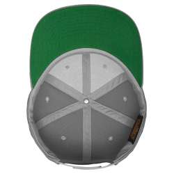 Mycket populär ljusgrå snapback-keps med platt skärm, grön underskärm, förstärkt frontpanel och matchande plastspänne i nacken. Passar 52-62 cm men sitter bäst runt 55-59 cm.