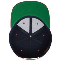 Mycket populär marinblå/röd snapback-keps med platt skärm, grön underskärm, förstärkt frontpanel och matchande plastspänne i nacken. Passar 52-62 cm men sitter bäst runt 55-59 cm.
